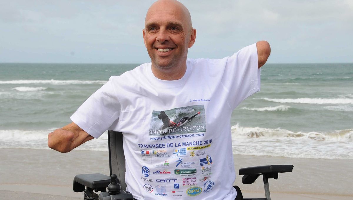 Philippe Croizon, né le 20 mars 1968 à Châtellerault dans la Vienne, grandit auprès d'un père brocanteur et d'une mère ouvrière chez Aigle dans la commune d'Oyré au nord-est de Châtellerault, et devient ouvrier métallurgiste aux Fonderies du Poitou entreprise implantée à Ingrandes-sur-Vienne spécialisée dans l'équipement automobile. Le 5 mars 1994 alors qu'il est en train d'enlever l'antenne TV du toit de sa maison à vingt-six ans, il entre en contact avec une ligne électrique de 20 000 volts qui le traverse pendant vingt minutes provoquant un arrêt cardiaque puis une seconde décharge qui le ranime. Hospitalisé trois mois en centre de soins intensifs et après plus de cent heures de chirurgie et cent anesthésies générales où son cœur s'est arrêté plusieurs fois, il subit l'amputation de son bras gauche, de son bras droit, de sa cuisse droite et de son membre inférieur gauche pour garder la vie sauve, et s'ensuit une longue traversée du désert où il n'est plus question de vivre mais de survivre.